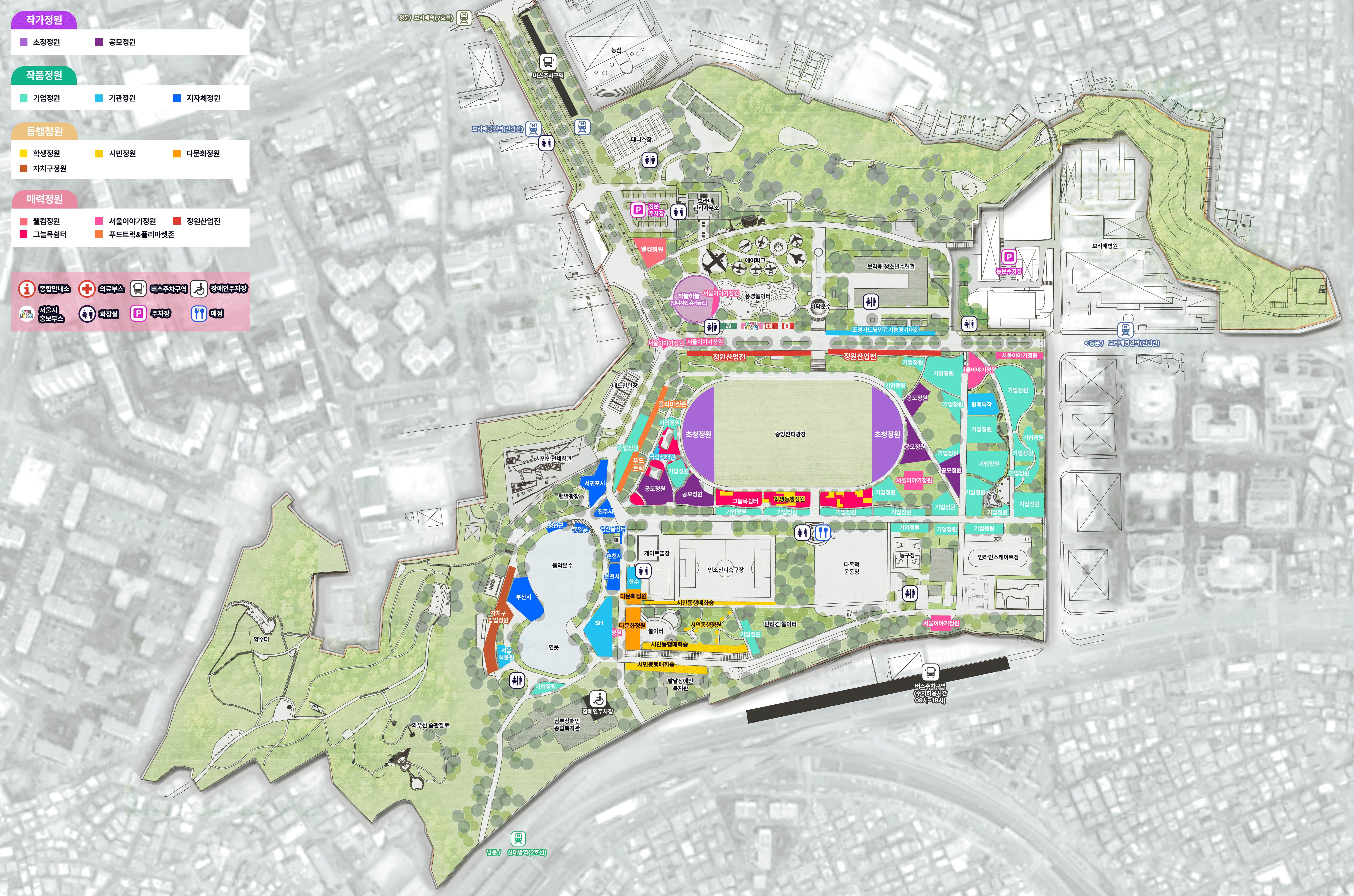 정원이 작품이 되는 국내외 ‘작가정원’은 독일 조경가 마크 크리거(작품명 Aviators Garden), ‘2024 서울특별시 조경상’ 대상 수상자 박승진(작품명 The Third Track)이 참여한 초청정원 2개와 공모정원 5개로 구성됩니다. 공모정원은 ‘세 번째 자연’을 주제로 한 국제공모에 선정된 대한민국 작가 3팀, 이탈리아 1팀, 독일·체코 1팀 등 5개 작품으로 구성되며, 시민이 직접 주변 경관과 어우러지는 식재 디자인과 특별한 스토리를 담아 조성하는 ‘동행정원’은 조경 전공 학생이 참여한 ‘학생정원’ 10개와 ‘시민정원’은 16개입니다. 이와 함께 한국 거주 외국인이 직접 만든 ‘다문화정원’도 11개를 선보입니다. 가장 큰 규모로 조성되는 ‘작품정원’에서는 친환경 사회공헌과 민관협력으로 진행된 ‘기업정원’, 유관 기관·지자체의 정체성과 노하우를 담은 ‘기관정원’, ‘지자체정원’ 등 총 33개를 만나볼 수 있습니다. 이 외에도 서울시의 주요 정책을 정원으로 풀어낸 ‘서울이야기정원’과 박람회 입구를 밝히는 ‘웰컴정원’, 서울시 자치구들이 참여한 ‘자치구정원’ 등 특별한 매력정원들도 곳곳에 마련되어 111개의 테마 정원이 맞이해줍니다.